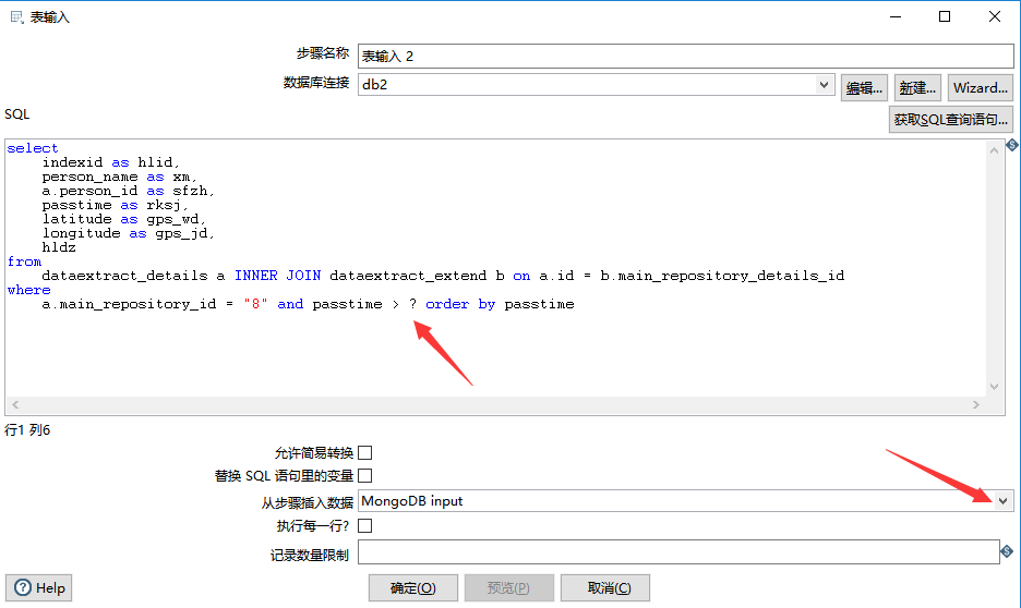 设置 mysql 数据库 jdbc 连接后,填好 SQL 语句之后,在下方的“从步骤插入数据”下拉列表中,选中“MongoDB input”。“MongoDB input” 中的变量,在 SQL 语句中用 ? 表示,如下图所示: