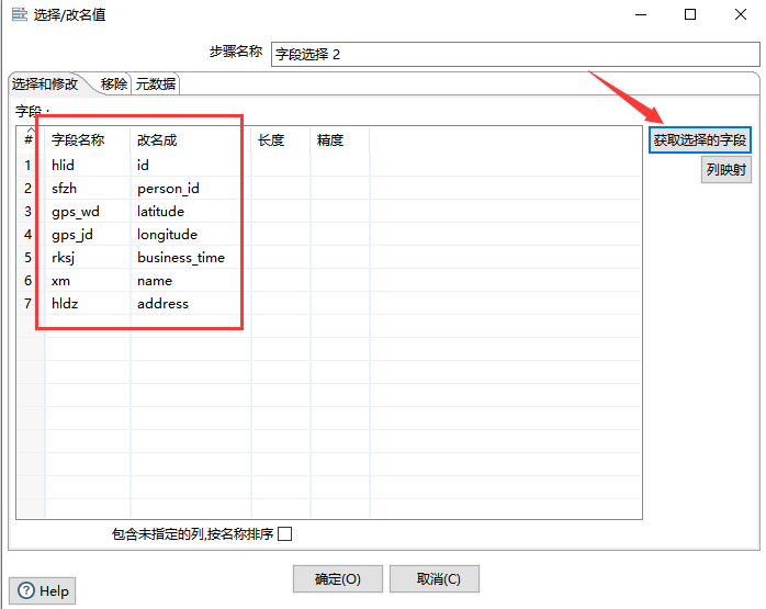 如果查询出来的列名需要更改,则可以使用“字段选择”组件,该组件还可以移除某字段,本次应用中,主要使用该组件将字段名进行修改。如下图所示: