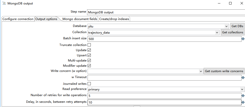 更多 MongoDB output 可参考:https://wiki.pentaho.com/display/EAI/MongoDB+Output
