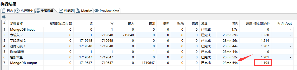 可通过点击 “执行结果” --> “步骤度量” 来查看各组件运行状态,如下图所示: