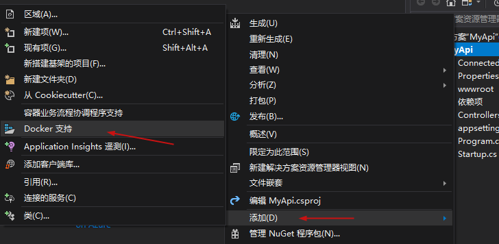 1.项目右键,添加Docker支持,选择Linux目标操作系统(因为新版Win10带Linux系统)