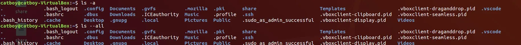如果要展示所有文件,需要在ls这条命令后加一个空格,加上参数a或者all,注意一点,如果是一个字母的参数a,形式为-a,如果是多字母的参数all,形式为--all。可以看到,这次输出的文件明显比单单输入ls的多,主要是以.开头的文件在linux系统中是隐藏文件,单单输入ls不会显示这些隐藏文件。