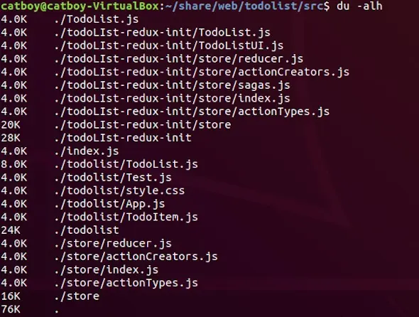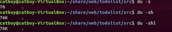 du(disk usage)命令,输出文件和目录所占空间大小,包括当前层级和所有子目录,我们可以结合之前的-a,-l,-h参数一起使用