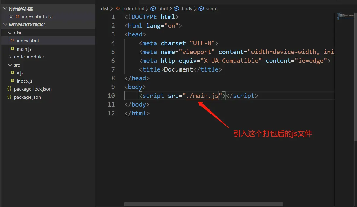 //这里我来详细描述一下:每次webpack打包都会在dist会生成一个js文件,然后建立一个html文件来引用这个js文件将代码显示在网页上。这样比较麻烦,不如我们来写一个html模板,将这个模板自动打进出口文件来进行引用