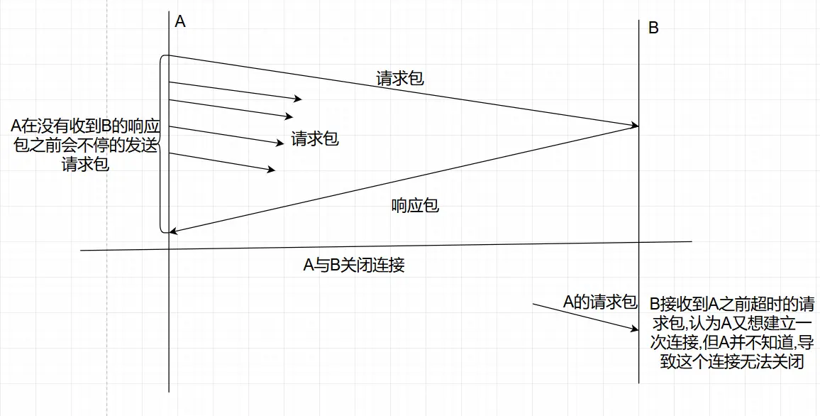 假如二次握手,B的请求不是有来有回,单向消息,而且还会有一个问题,就是之前A向B发送多个请求包,如果有一个请求包超时,A与B都完成通信,结束了连接.这时B收到A之前发送的超时请求包,会认为A又建立一次连接.但A不知道,这次的连接不会终止.