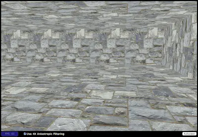 通过使用各向异性过滤,我们更改了在这些特殊场景下mipmaps的采样方式(译者:采样窗口有可能为非标准的矩形甚至平行四边形等等),从而使图像更加清晰。