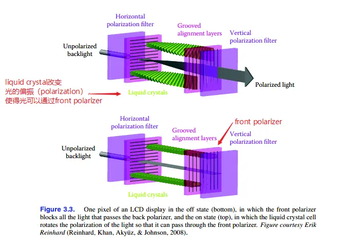 中间部分的液晶分子(Liquid crystals)转动后可改变光的偏振,从而决定光是否能透过front polarizer,以此控制光的显示