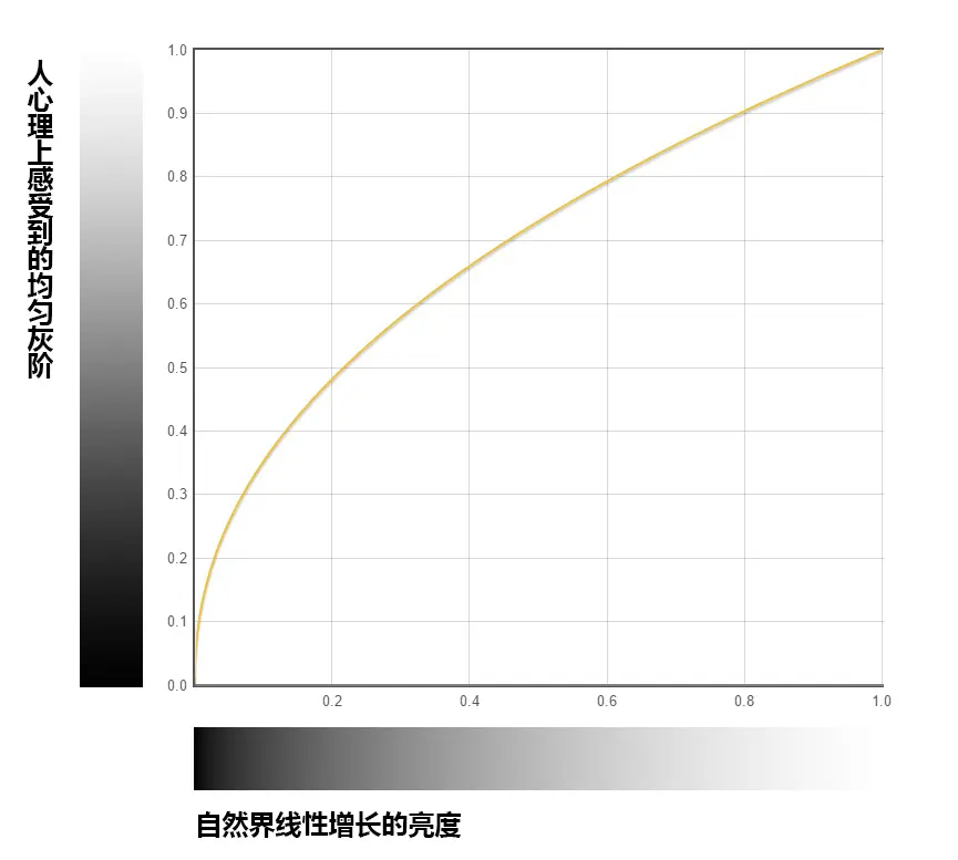 人类对于光的强度感受并非是线性的(图自知乎——色彩校正中的 gamma 值是什么? - 韩世麟的回答)。