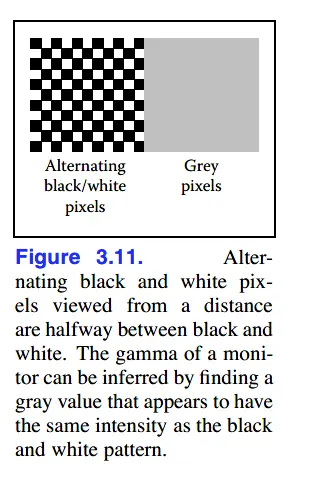 那么我们如何找到α值呢?有一个标准的方法,显示一个棋盘状、黑白相间的图像,相邻一个α值灰色方阵图像。当从远处看时,若两幅图像看起来大致相同,则α值恰好是黑白的中间值。