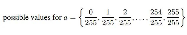 之前提到像素值的取值范围是[0, 1],是通过固定大小的int类型操作的。比较通用的便是8bit位用于表示0-255。这意味着像素值取值并不是[0, 1]中的任何一个值,而是如下: