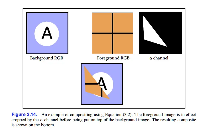 图片中,在背景上插入前景图像需要做合成(compositing)。举个例子,对于不透明的前景图像,直接替换背景像素即可;对于完全透明的前景图像,不需要对背景像素做任何修改;对于透明的前景图像来说,就需要注意了。