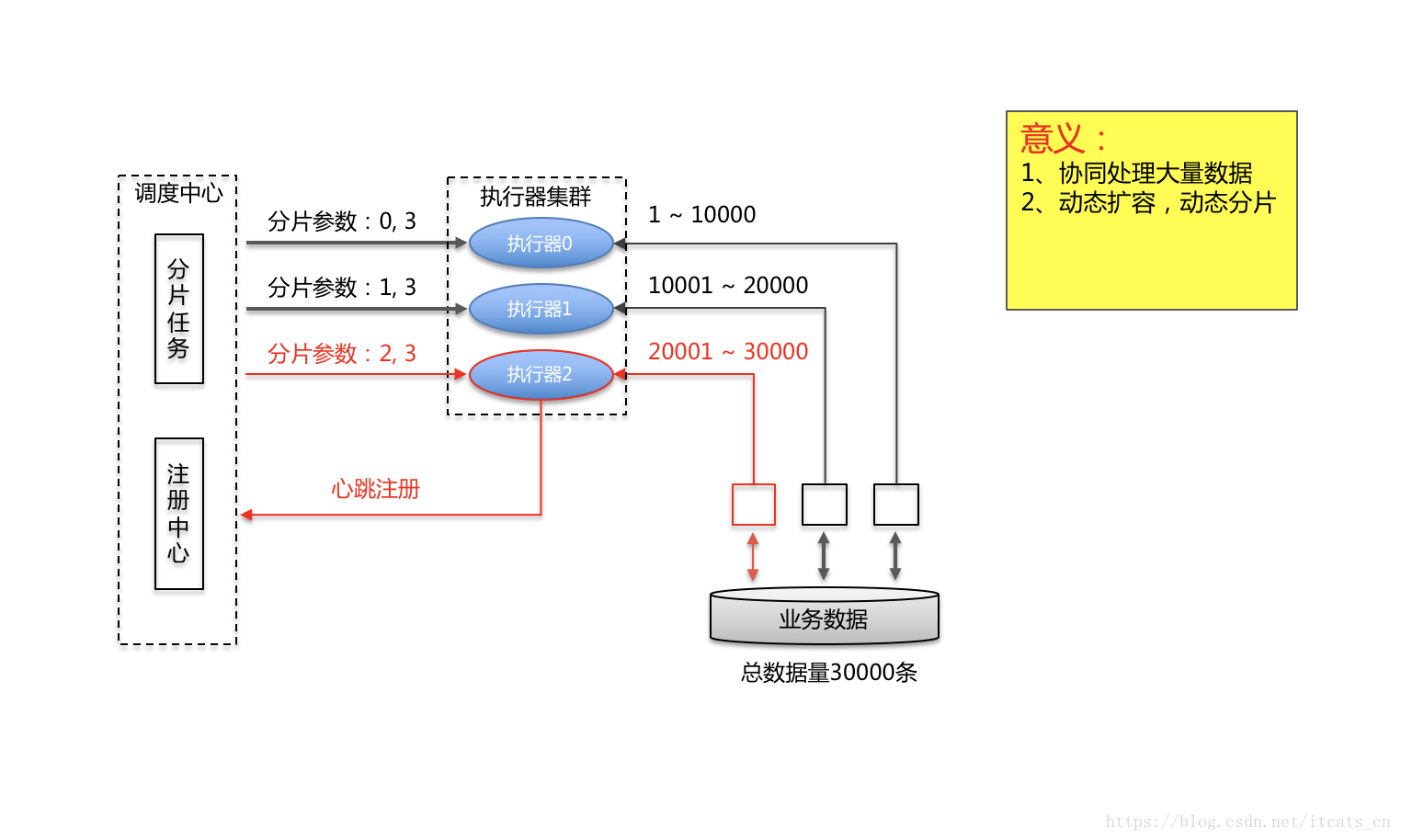 从这个架构图,可以看到,集群/分布式/水平扩展。通过调度中心的分片来分发不同的数据给不同的机器处理。
