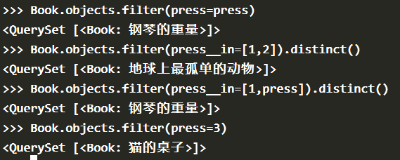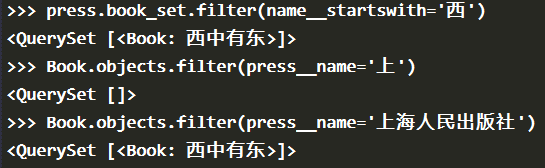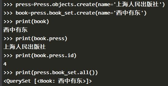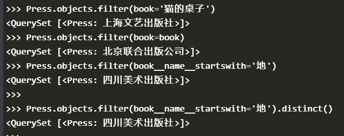 之前是以 Press 对象为条件,查询出对应的 Book 对象的。我们还可以反向查询,即以 Book 对象为条件,查询出对应的 Press 对象:
