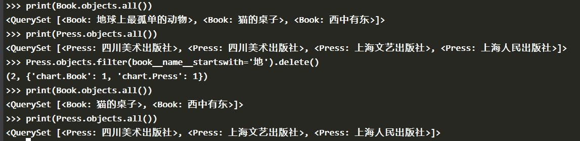 因为之前为 Book 模型的 press 字段设置了级联删除,所以如果删除了一个出版社(Press 实例),那么所对应的书(Book 实例),也会被一并删除。