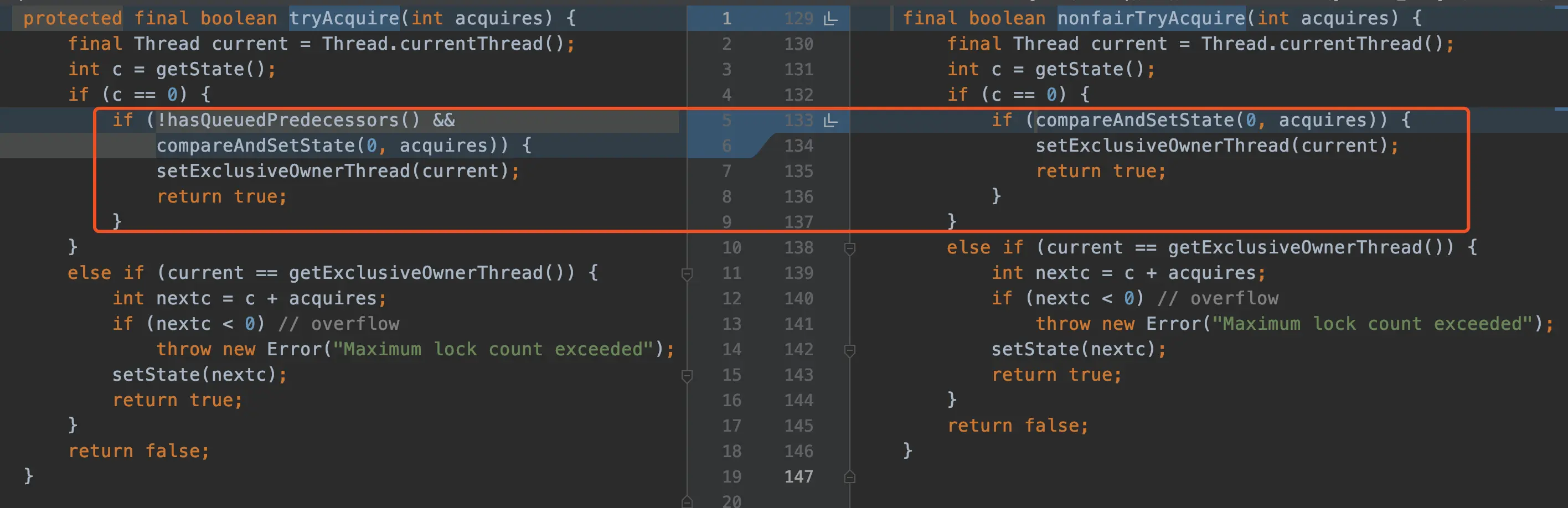 我们观察到实际获取锁的逻辑在tryAcquire方法中,我们对NonfairSync和FairSync中(左为FairSync)该方法做横向比较来看看他们的区别是什么,