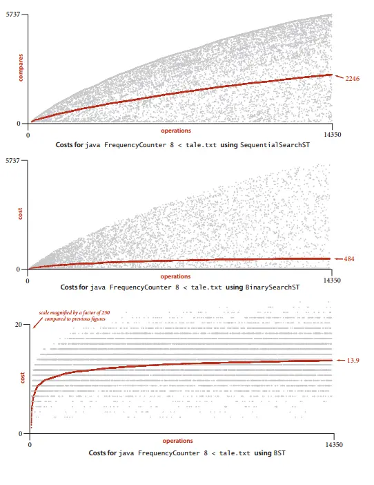 英文原版《双城记》中大于7个字符的单词一共14350个,这些单词中不同的单词有5737个,将这些单词作为键来测试不同符号表实现的性能,结果如下: