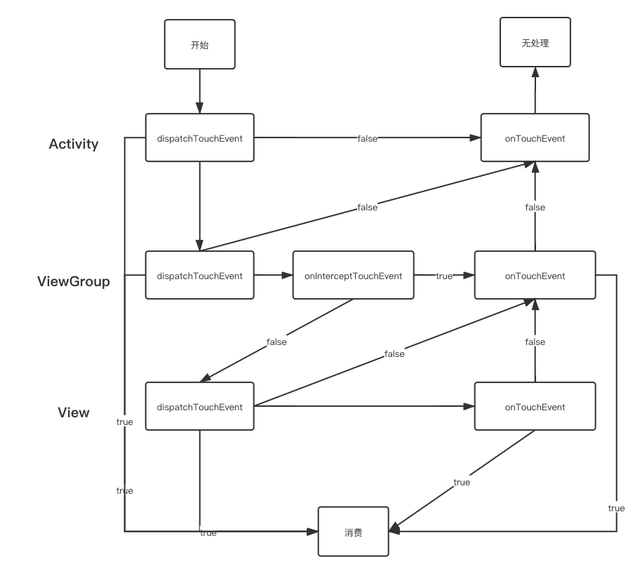 MotionEvent)传递到某个具体的View/ViewGroup然后被处理的过程。事件大致传递的流程是从Activity -> ViewGroup -> View。