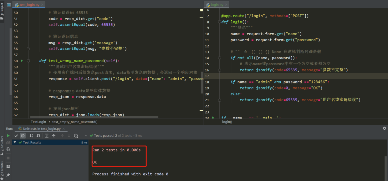 看清楚了上面关于unittest测试框架的基本写法之后,下面来写一个登录的视图函数,然后再写一个视图函数的单元测试。