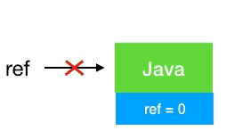 如果在上述代码后面添加一个 ref = null,则由于对象没被引用,引用次数置为 0,由于不被任何变量引用,此时即被回收,动图如下