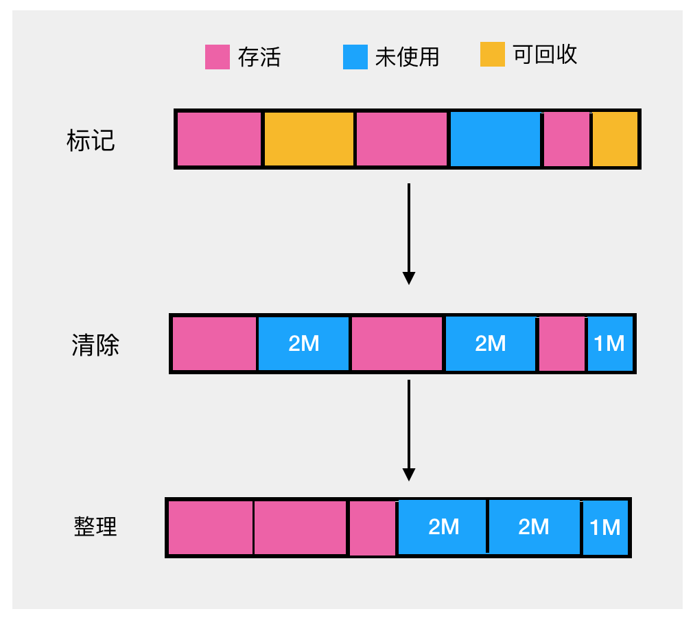 前面两步和标记清除法一样,不同的是它在标记清除法的基础上添加了一个整理的过程 ,即将所有的存活对象都往一端移动,紧邻排列(如图示),再清理掉另一端的所有区域,这样的话就解决了内存碎片的问题。