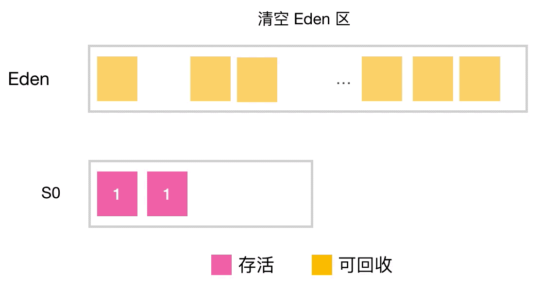我们之前怎么说来着,大部分对象在短时间内都会被回收, 所以经过 Minor GC 后只有少部分对象会存活,它们会被移到 S0 区(这就是为啥空间大小 Eden: S0: S1 = 8:1:1, Eden 区远大于 S0,S1 的原因,因为在 Eden 区触发的 Minor GC 把大部对象(接近98%)都回收了,只留下少量存活的对象,此时把它们移到 S0 或 S1 绰绰有余)同时对象年龄加一(对象的年龄即发生 Minor GC 的次数),最后把 Eden 区对象全部清理以释放出空间,动图如下