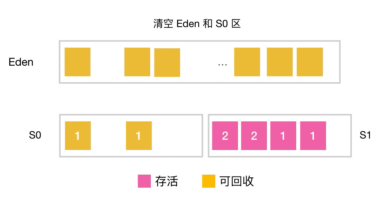 当触发下一次 Minor GC 时,会把 Eden 区的存活对象和 S0(或S1) 中的存活对象(S0 或 S1 中的存活对象经过每次 Minor GC 都可能被回收)一起移到 S1(Eden 和 S0 的存活对象年龄+1), 同时清空 Eden 和 S0 的空间。