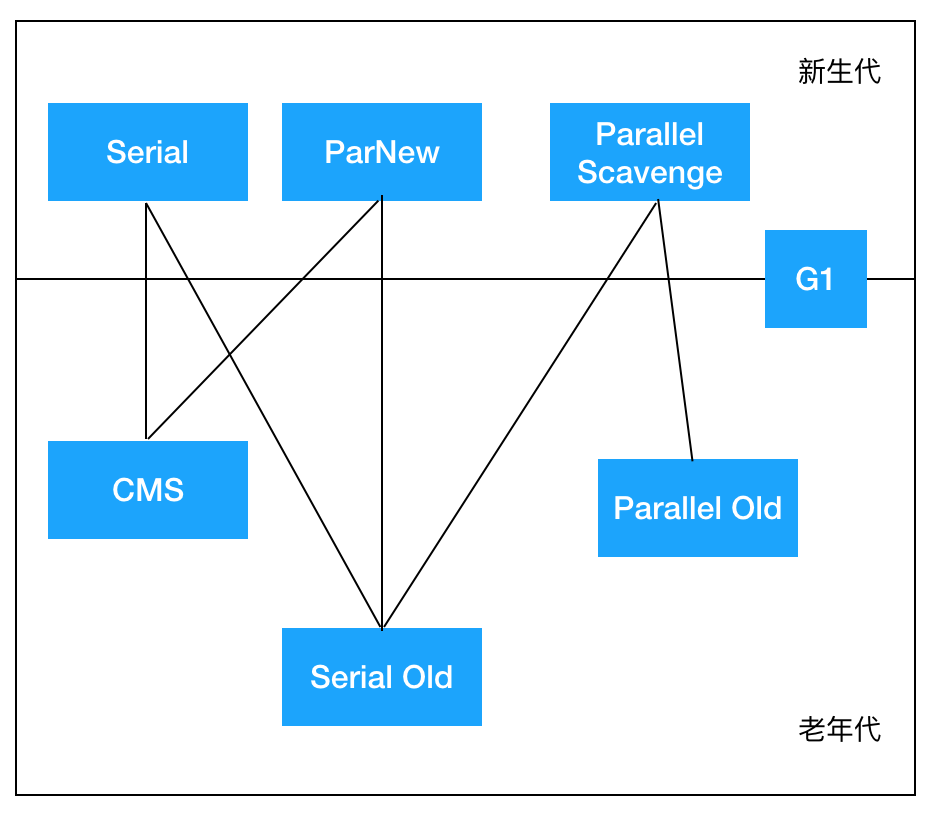 - 同时在新老生代工作的垃圾回收器:G1 图片的垃圾收集器如果存在连线,则代表它们之间可以配合使用,接下来我们来看看各个垃圾收集器的具体功能。