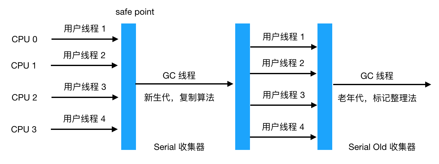 上文我们知道, Serial 收集器是工作于新生代的单线程收集器,与之相对地,Serial Old 是工作于老年代的单线程收集器,此收集器的主要意义在于给 Client 模式下的虚拟机使用,如果在 Server 模式下,则它还有两大用途:一种是在 JDK 1.5 及之前的版本中与 Parallel Scavenge 配合使用,另一种是作为 CMS 收集器的后备预案,在并发收集发生 Concurrent Mode Failure 时使用(后文讲述),它与 Serial 收集器配合使用示意图如下