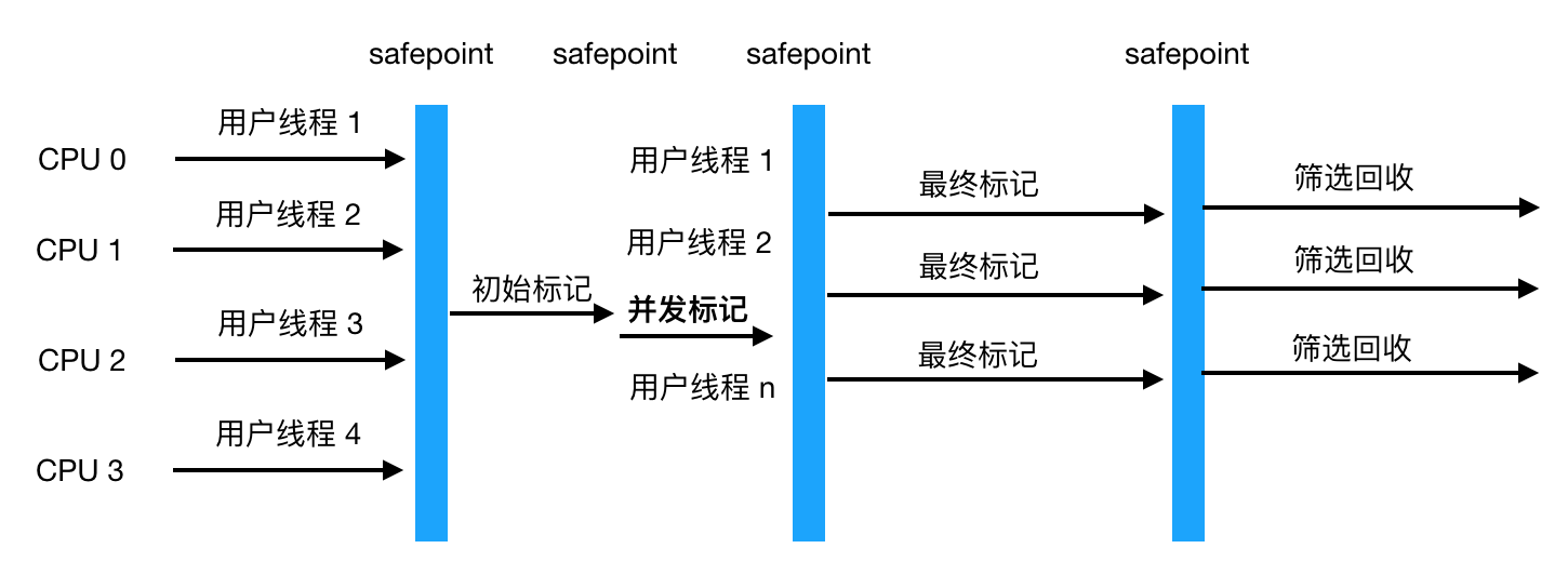 从图中可以的看到初始标记和重新标记两个阶段会发生 STW,造成用户线程挂起,不过初始标记仅标记 GC Roots 能关联的对象,速度很快,并发标记是进行 GC Roots Tracing 的过程,重新标记是为了修正并发标记期间因用户线程继续运行而导致标记产生变动的那一部分对象的标记记录,这一阶段停顿时间一般比初始标记阶段稍长,但远比并发标记时间短。