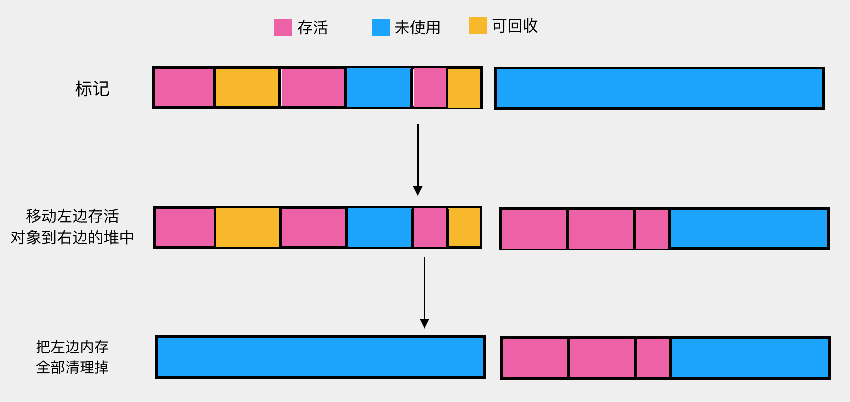 把堆等分成两块区域, A 和 B,区域 A 负责分配对象,区域 B 不分配, 对区域 A 使用标记法标记出存活对象,然后把区域 A 中存活的对象都复制到区域 B(存活对象都依次紧邻排列)最后把 A 区对象全部清理掉释放出空间,这样就解决了内存碎片的问题了。