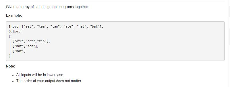 最通用的一种解法,对于每个字符串,比较它们的每个字符出现的个数是否相等,相等的话就把它们放在一个 list 中去,作为一个类别。最外层写一个 for 循环然后一一比较就可以,还可以用一个等大的布尔型数组来记录当前字符串是否已经加入的了 list 。比较两个字符串的字符出现的次数可以用一个 HashMap,具体看代码吧。