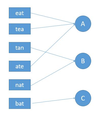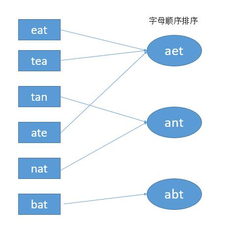 我们将每个字符串按照字母顺序排序,这样的话就可以把 eat,tea,ate 都映射到 aet。其他的类似。