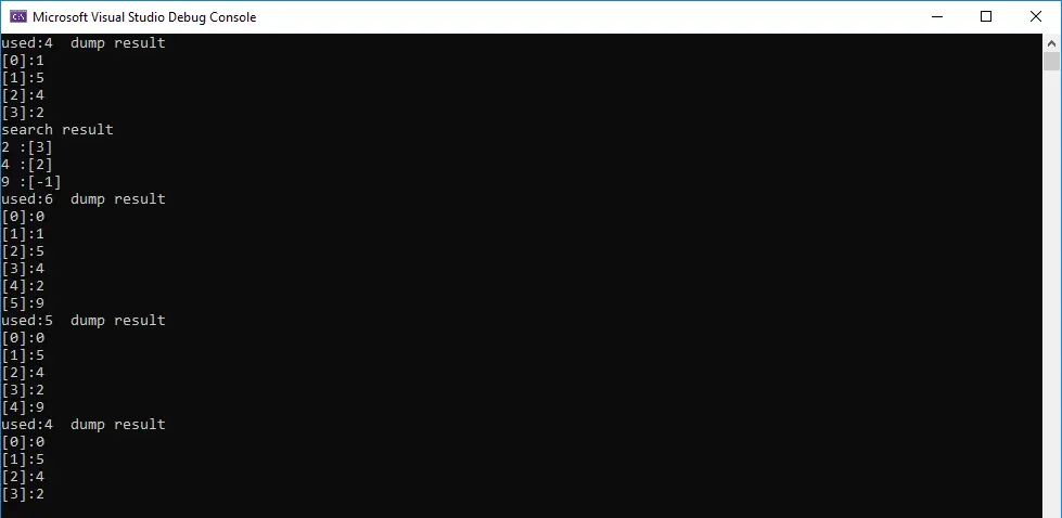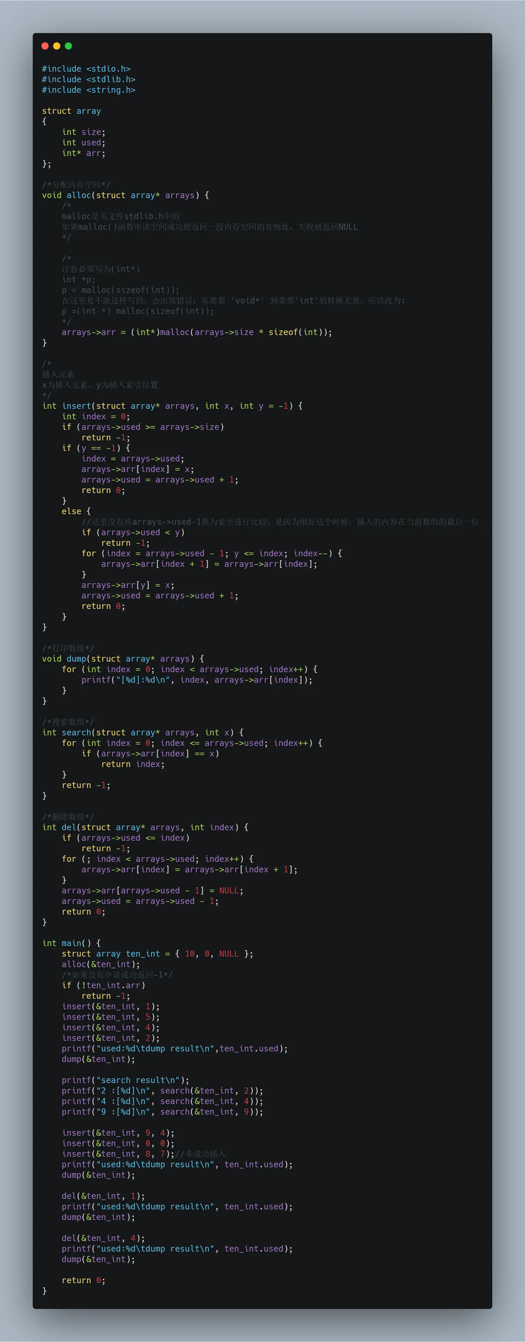 之后便是插入元素的insert函数、打印数组的dump函数、搜索数组的search函数和删除数组的del函数