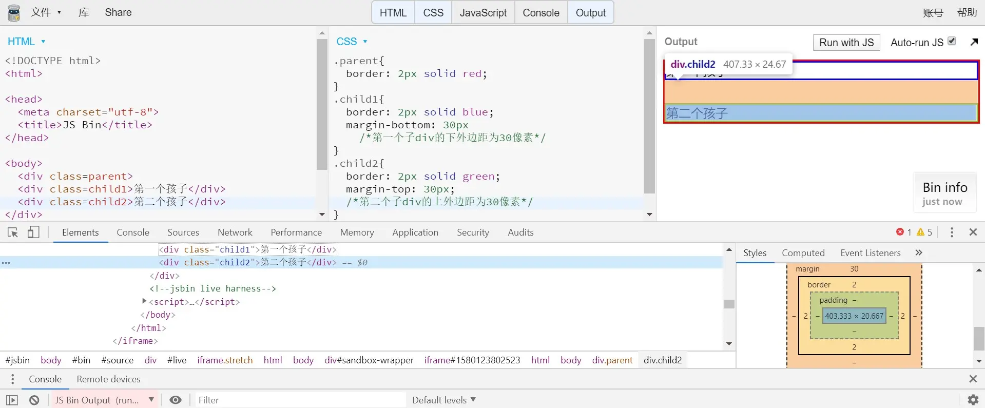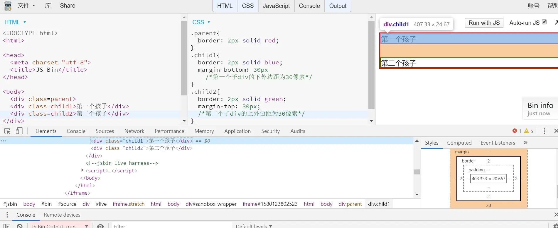 将第一个子div的下外边距设为30像素,第二个子div的上外边距设为30像素,而最终两个子div之间只有30px的外边距,如下图,这种情况就为兄弟合并。这是个好现象!