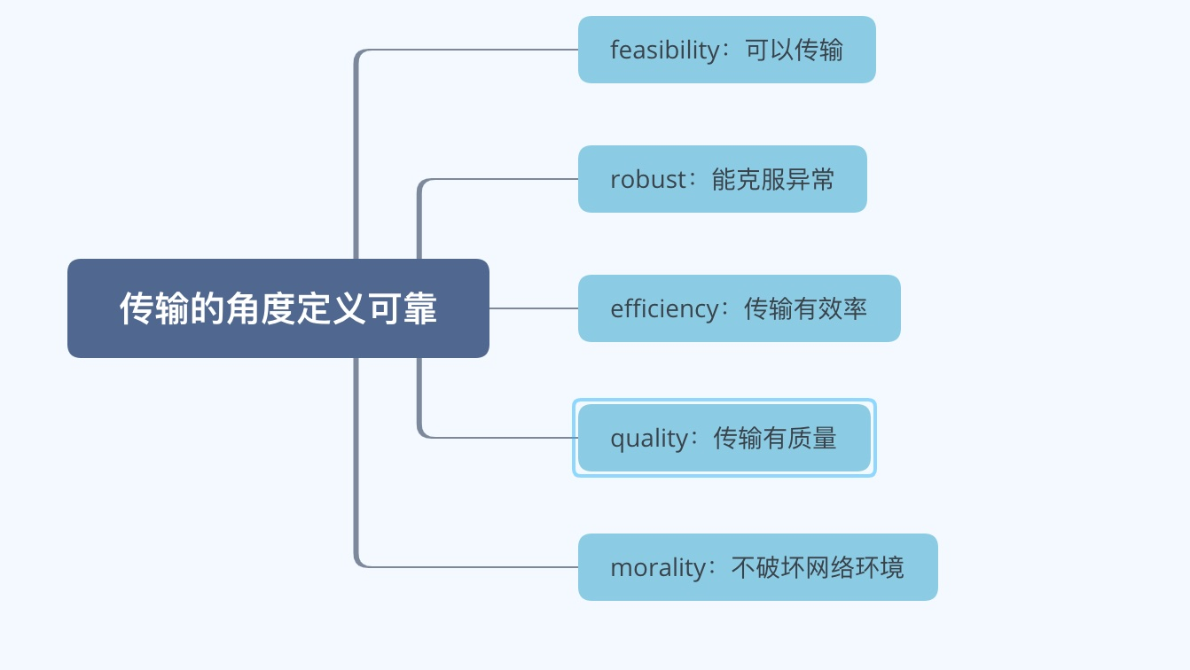 从传输这件事的完成情况角度思考,有三个对可靠的定义:1)可以传输(feasibility);2)遇到异常的时能克服(robust);3)传输十分高效(efficiency);4)传输的有质量(quality);5)传输有公德心的不破坏网络环境(morality);
