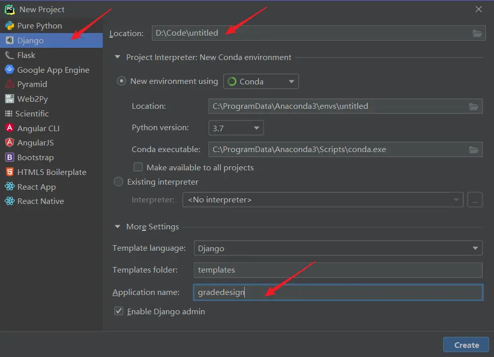 新建一个项目,选择 Django ,然后给项目起个名,最后别忘了 Application name 也是需要的,再点击 Create 。(注:新建项目自带 Django 框架是 专业版 自带的,社区版 没有这个功能,我是用学生邮箱注册免费使用的)