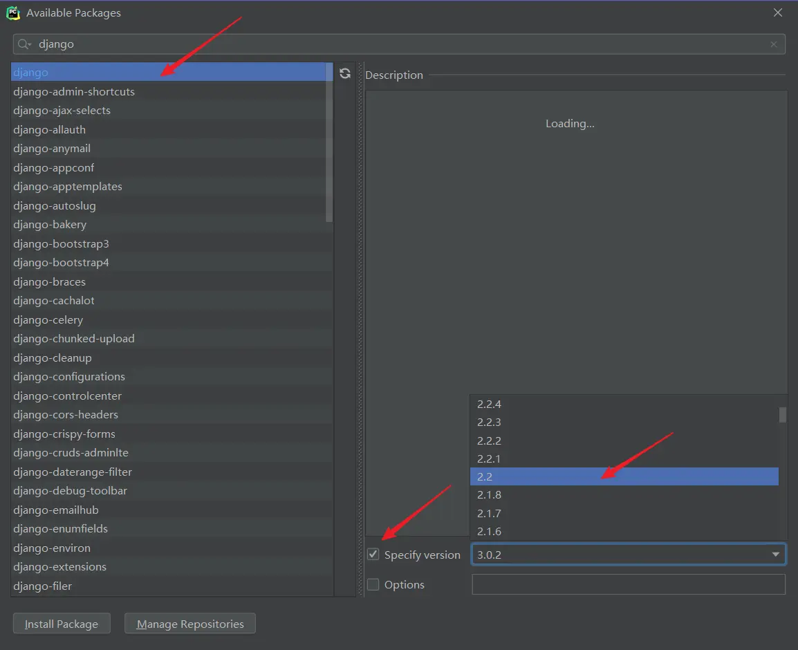 需要安装指定版本的 Django 的话,就需要点击右侧的 + ,然后在搜索框输入 django ,点击左上角第一行的 django ,再勾选右侧的 Specify version ,选择自己想要的版本即可。