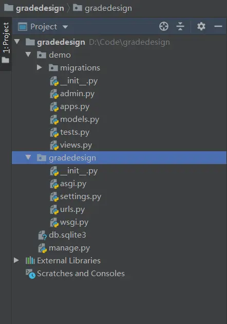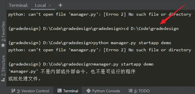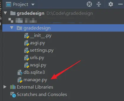 manage.py 是和 gradedesign 文件夹共存在 Code 这个大文件夹下的,不是在 gradedesign 文件夹下的 gradedesign 文件夹,这里也是我踩的一个坑。