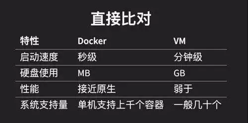 我们可以从下面这张表格很清楚地看到容器相比于传统虚拟机的特性的优势所在: