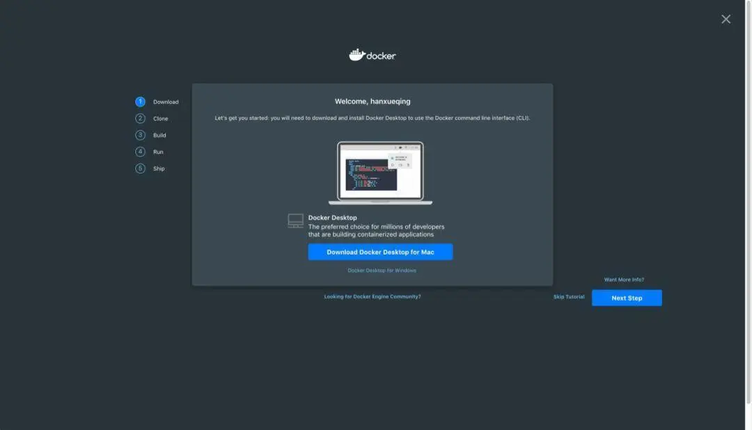 按照自己的操作系统,选择相应的版本下载安装到本地。它这上面还很温馨的给你提供了一些小的教程,按照左侧五个步骤一步一步来就会get Docker的基本操作。