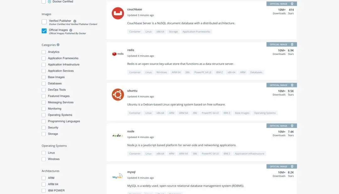我们在Docker官网中的这个页面上查看Docker支持的所有镜像,可以看到我们常用的nodejs、mySQL、mongoDB、PHP都有提供。
