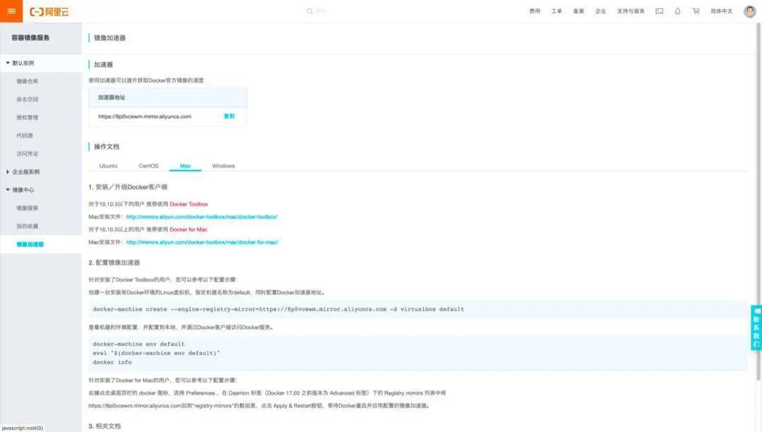 由于Docker的服务器在国外,为了保证我们接下来的下载体验更酸爽,在开始之前先获取一个国内的镜像,这里再吹一波马云爸爸,阿里云真香!