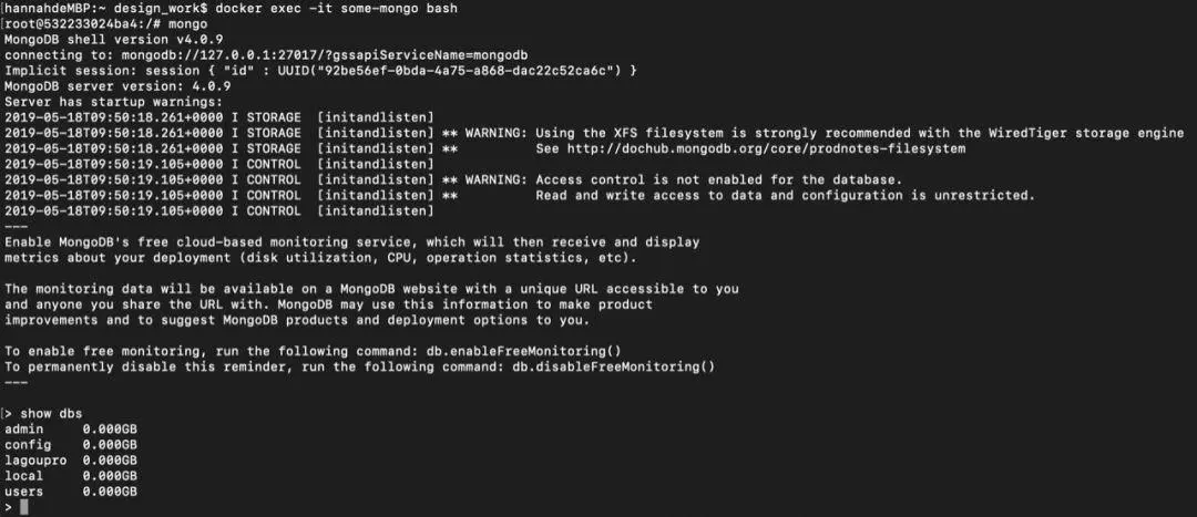 查看自己的容器启动好之后就可以运行docker exec -it some-mongo bash命令,然后输入mongo就可以优雅地连接mongoDB数据库了。