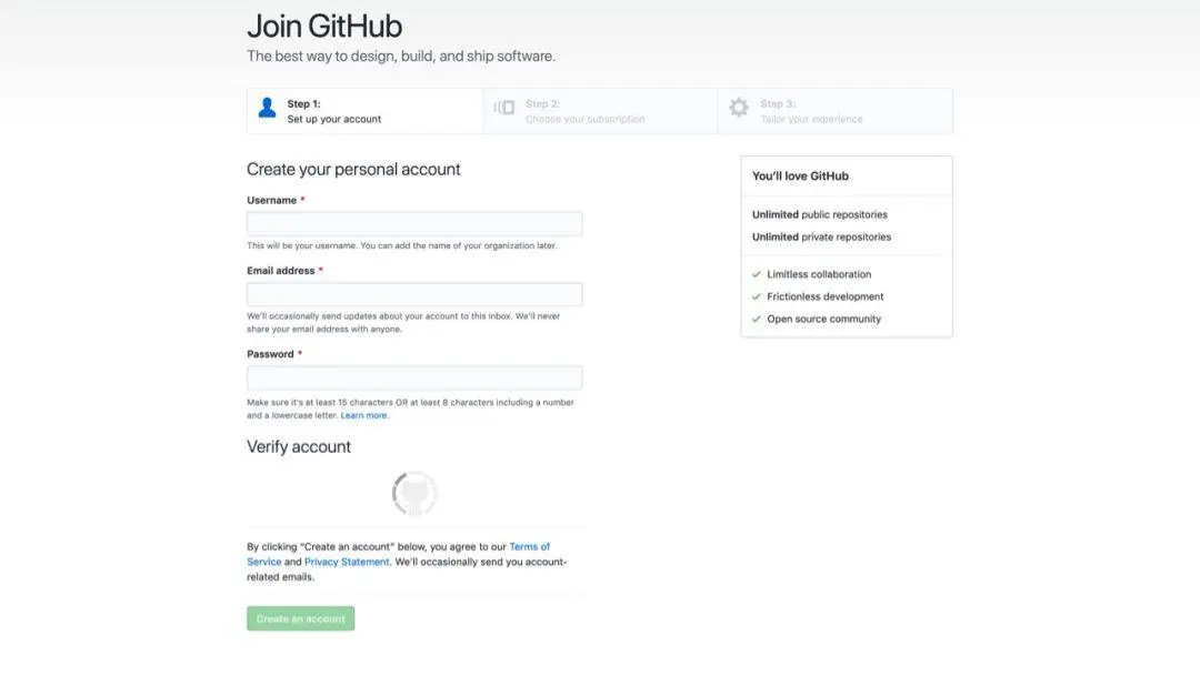 在Github网站填写用户名、邮箱、密码注册个人账户。