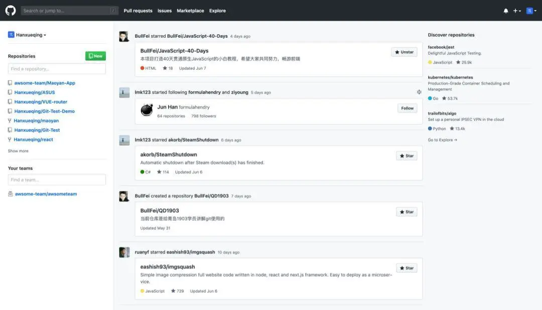 **时间线:**你关注的人的一些活动,比如说他创建了新的仓库,或者star、fork了某些项目等等这些操作就会显示在这里,类似微博动态。