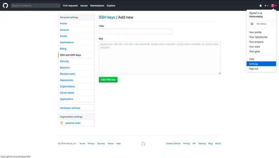 进入github网站在右上角点击个人头像,在下方找到Settings,在左侧第六个选项中找到SSH and GPG Keys,点击New SSH key,将你的id_rsa.pub里的内容粘贴到Key中,填上任意的Title,保存,此时你就可以在本地向远程github仓库推送内容。