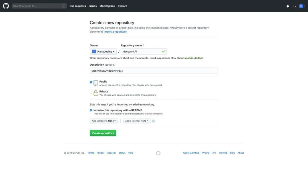 首先新建一个远程仓库,在Github主页右上角点击加号,选择第一个选项new repository,填写Repository name仓库名,Description描述,选择public属性,勾选Initial this repository with a README会自动生成一个MarkDown格式的README文档。这样我们就在远程创建好了一个Git仓库。目前Github上创建公开仓库是免费的,所有人都可以看到仓库中的内容,如果想创建私人仓库是收费的,它鼓励大家开源。