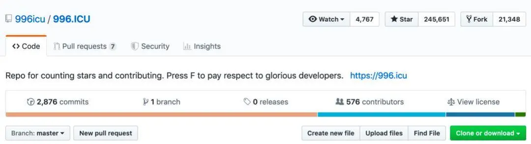 **Star:**类似于点赞,在Github上获得标星可比在社交网络中困难多了,一般能获得1000+star的项目就已经非常不错了。前一阵子在开发圈大火的996icu项目目前标星已经达到了245k。