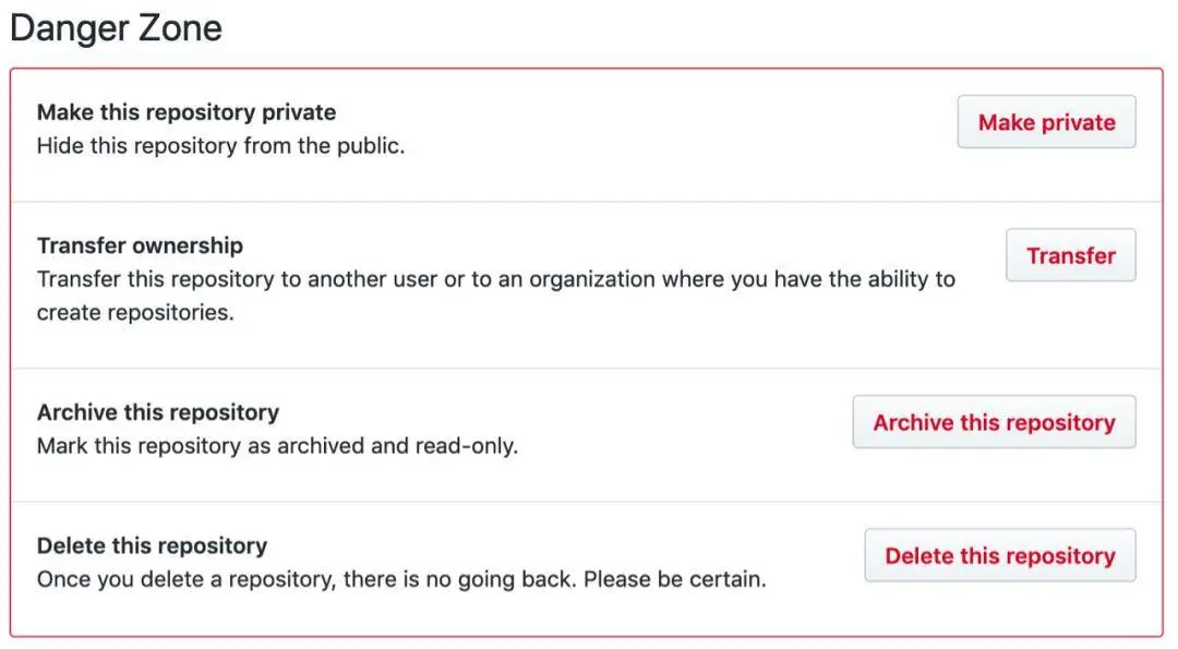 **Settings:**设置,在这里可以对当前仓库进行设置,例如仓库名更改,描述信息更改,以及删除当前仓库,不过这个操作比较危险,它会让你输入当前仓库名称进行二次确认,如果是仓库中有内容还会让你输入账户和密码再次进行确认,安全等级非常高。