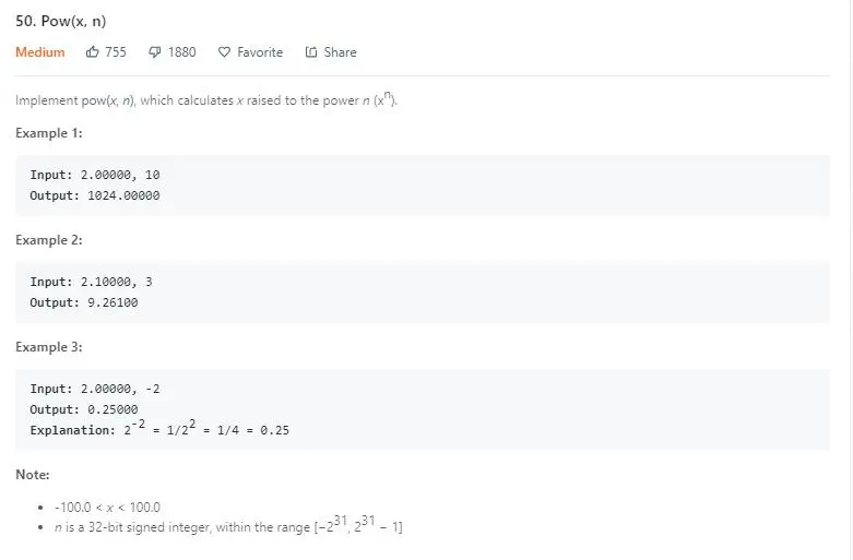 对于上边的解法,太慢了。可以优化下,类似于29题的思路。乘法的话,我们不用一次一次的相乘,得到 2 次方后,我们可以直接把 2 次方的结果相乘,就可以得到 4 次方,得到 4 次方的结果再相乘,就是 8 次方了,这样的话就会快很多了。